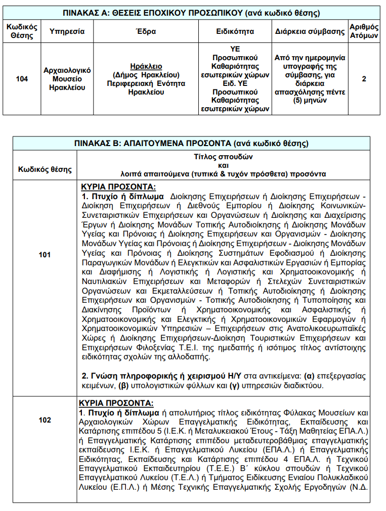 Το Ν.Π.Δ.Δ. ΑΡΧΑΙΟΛΟΓΙΚΟ ΜΟΥΣΕΙΟ ΗΡΑΚΛΕΙΟΥ Ανακοινώνει Την πρόσληψη, με σύμβαση εργασίας ιδιωτικού δικαίου ορισμένου χρόνου, συνολικά τεσσάρων (4) ατόμων για την κάλυψη αναγκών στο Αρχαιολογικό Μουσείο Ηρακλείου.
